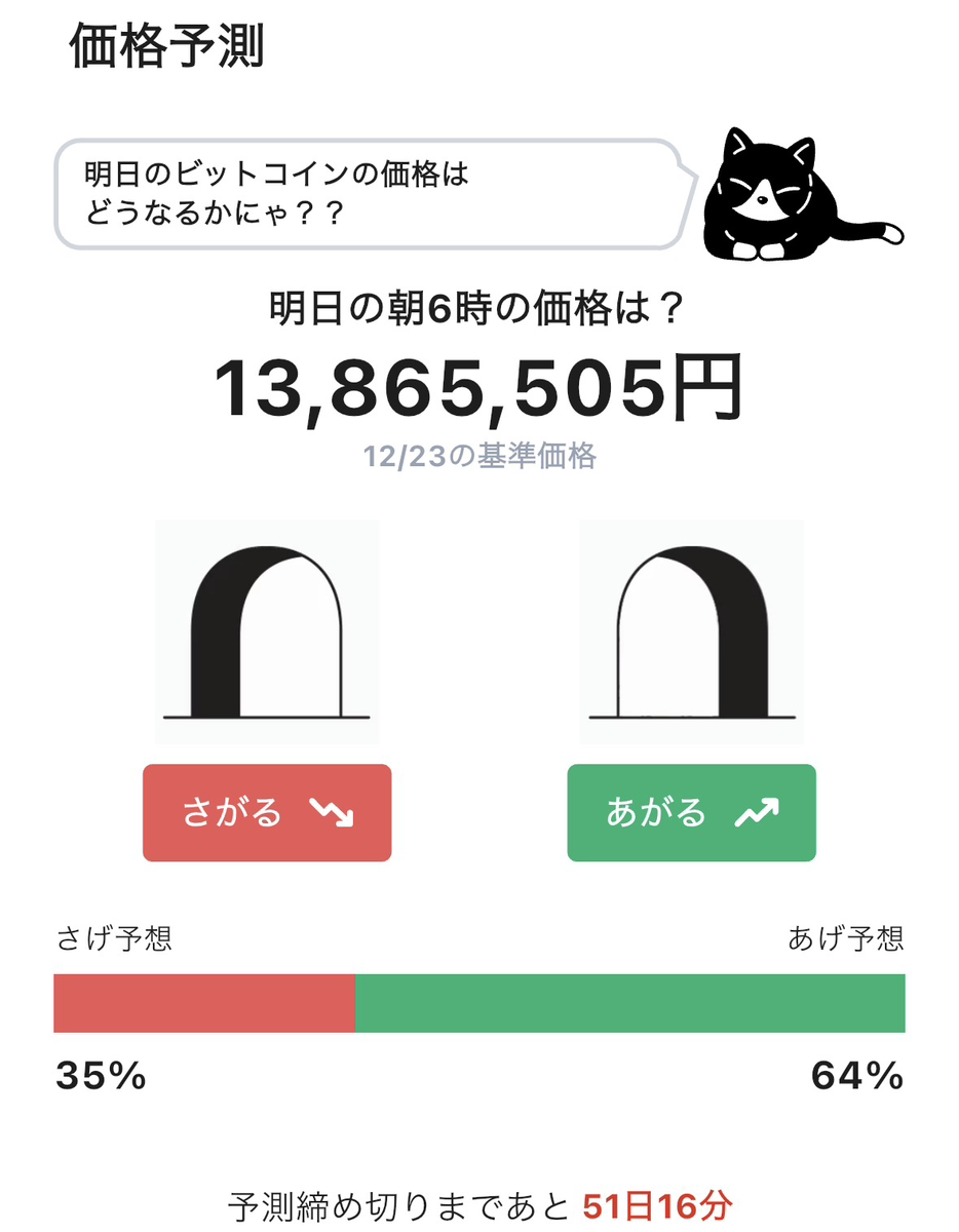 例えばビットコイン価格予想ゲームでは、翌日のBTC相場が上がるか下がるかをクイズ感覚で予想し、当たれば報酬がもらえます(外れても参加賞として少額のBTCが獲得できます)。