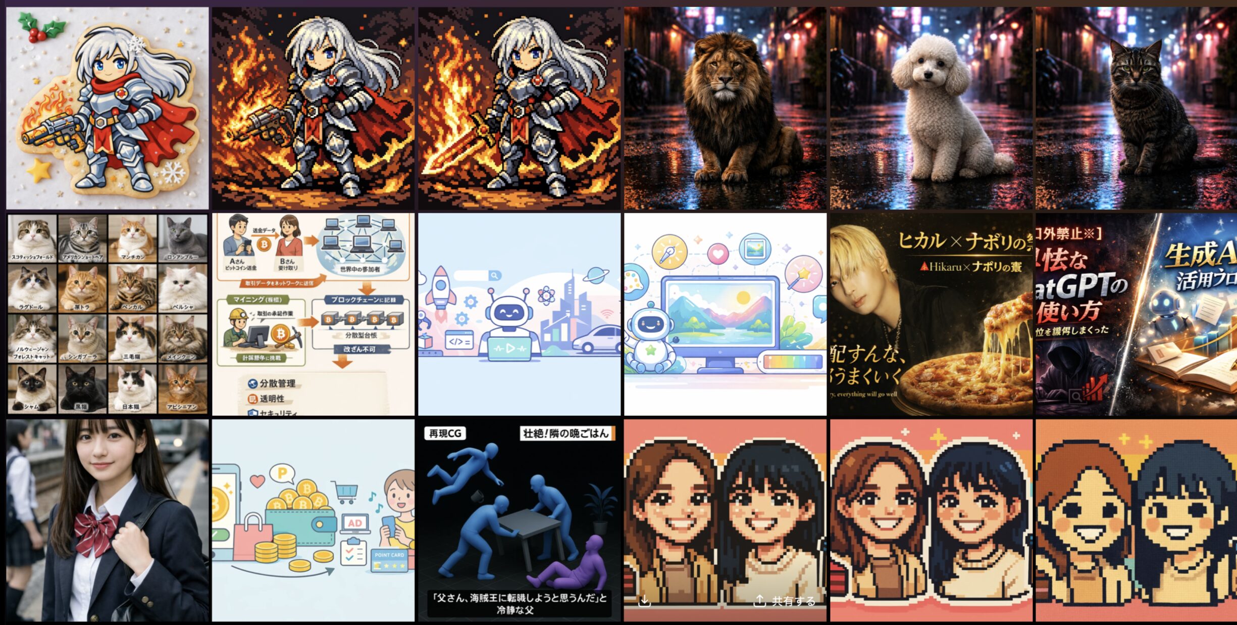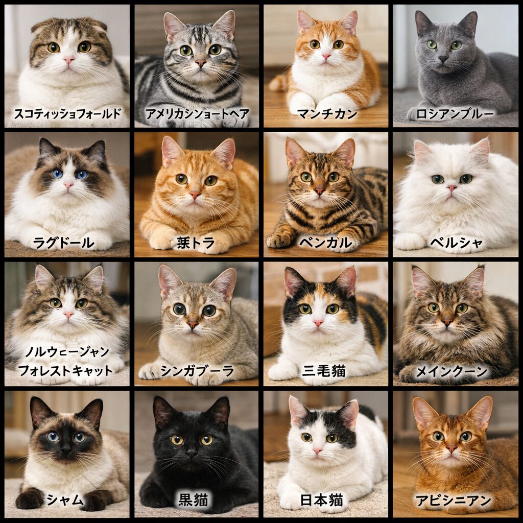 ▶︎プロンプト:「人気の猫の写真を生成して ・4×4マスに仕切られている(合計16種類の猫の写真) ・写真の下には猫種を日本語で書く ・画像サイズは正方形」