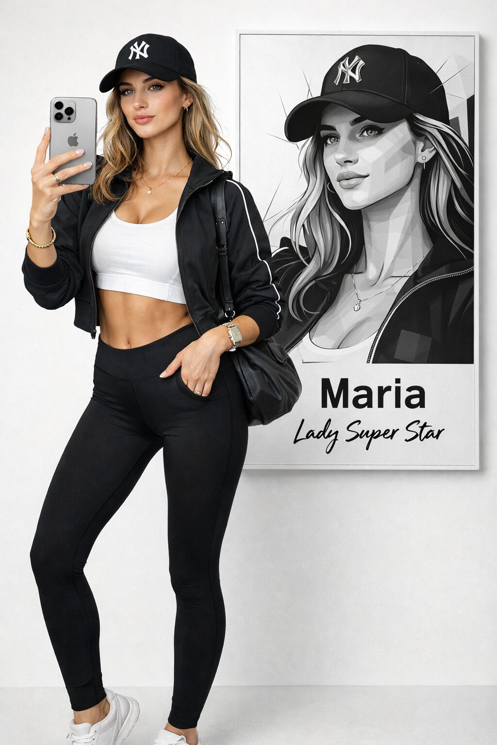 アップロードされた参照用の写真を使用し、全身を100%同一に保ち変更を加えず、グラフィック要素を取り入れた超写実的なポートレートを作成してください。 滑らかな純白のスタジオの壁背景で撮影。 被写体の隣に、シャープで角ばったライン、重なり合うポリゴン、ミニマリストでモダンなグラフィックスタイルの白黒の人物ベクターポートレートを描いたアートウォールを配置してください。 ベクターアートの下の文字は メインテキストとして「Maria」、その下に手書きフォントで「Lady Super Star」と配置。