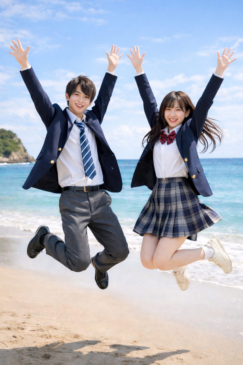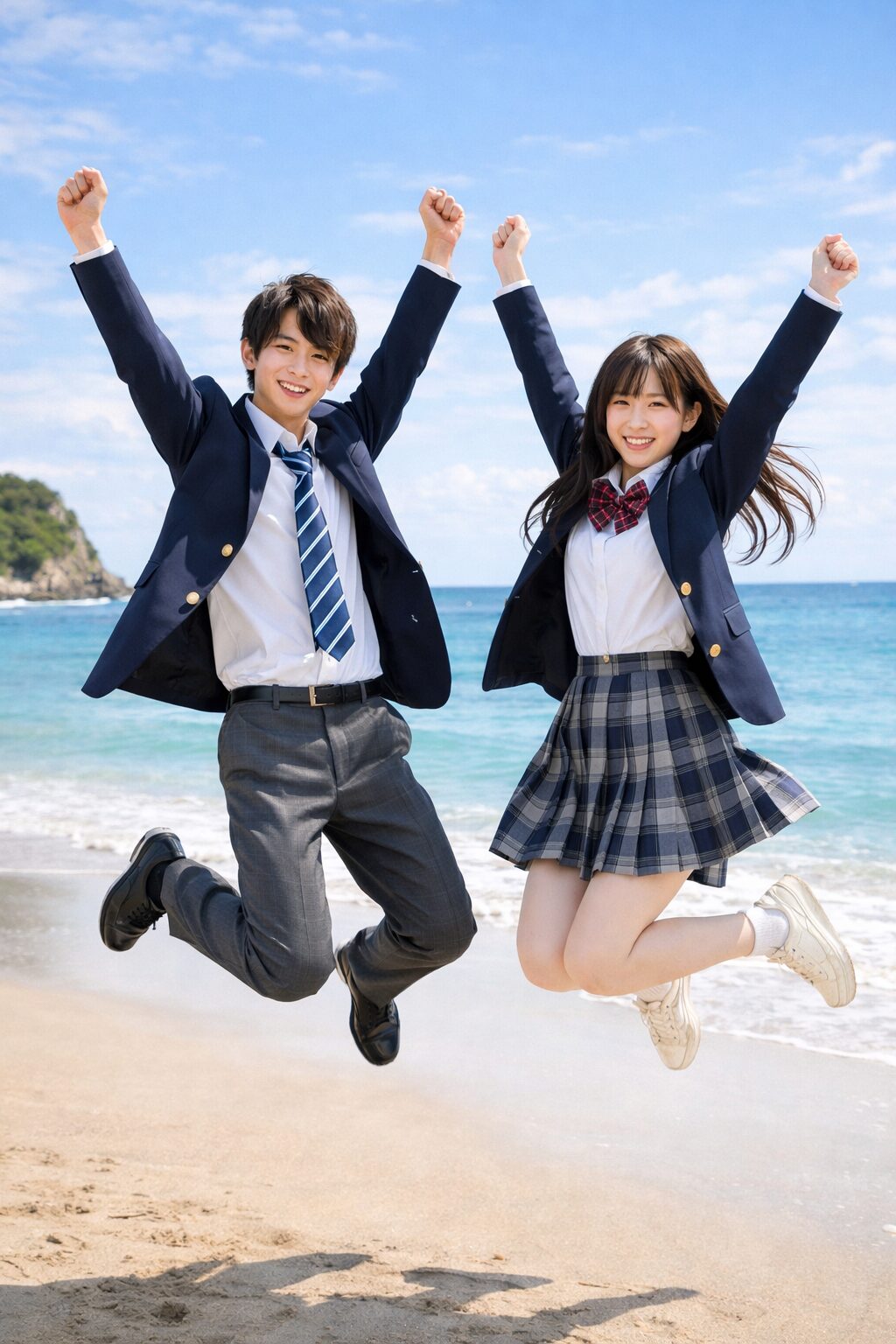 この二人の学生に共有したジャンプポーズを撮らせて。背景は浜辺で青春感のあるイメージ。