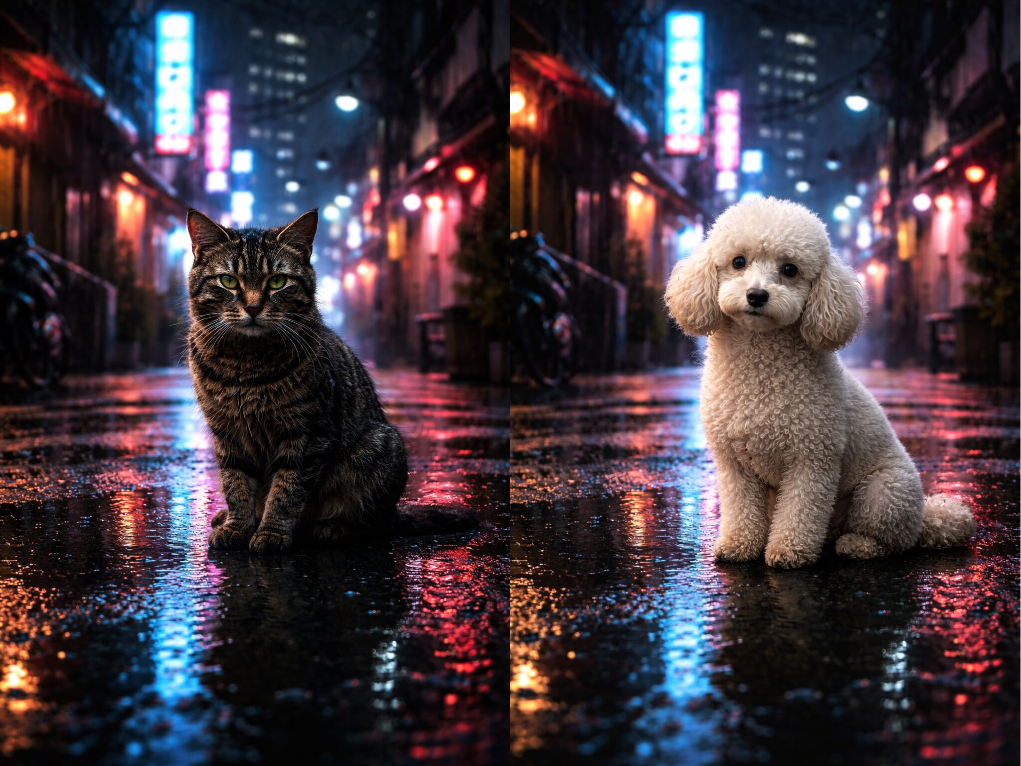 ▶︎プロンプト:雨に濡れた東京の裏路地、夜。巨大なネオンサインの光(青、紫、赤)が水たまりに反射している。一匹のたくましい野良猫が、濡れたアスファルトの上に座り、カメラを鋭い眼光で見つめている。毛並みの質感、雨粒、背景の複雑な街の光が超高解像度で描写されている。映画のようなドラマチックな照明、深い影と鮮やかな光のコントラスト。浅い被写界深度、美しい玉ボケ。最高峰のカメラで撮影された傑作写真、8k解像度、フォトリアリスティック。