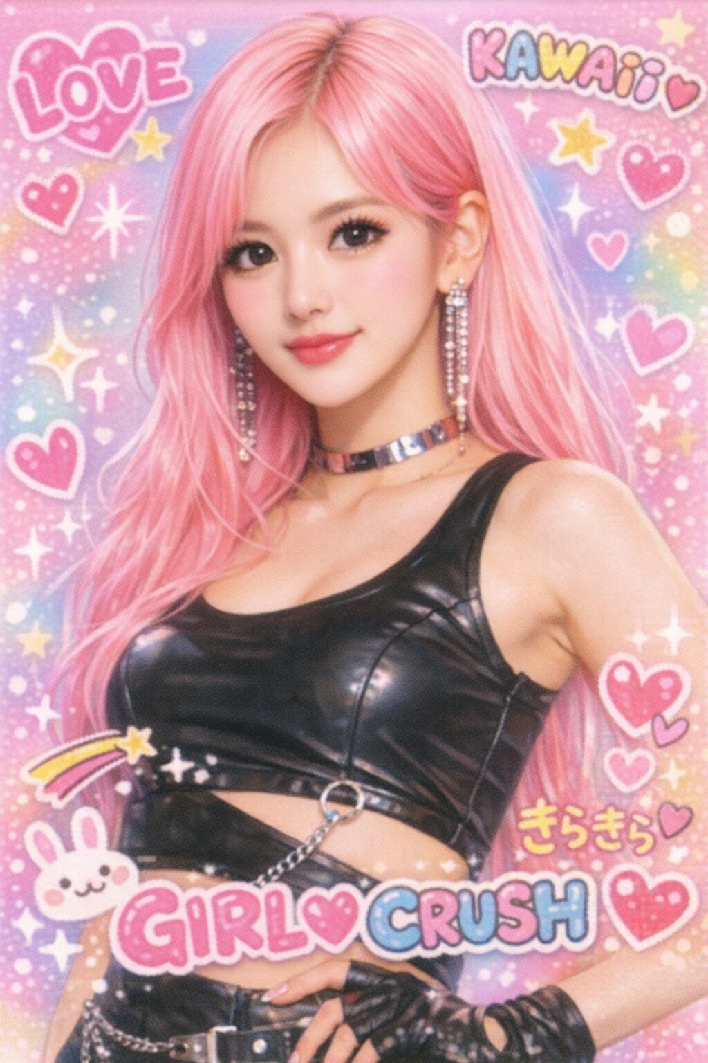 ピンク髪のK-POPアイドルのような美女を生成して。スタイルが良くて長身、ボディラインがわかるスタイリッシュな衣装を着用。