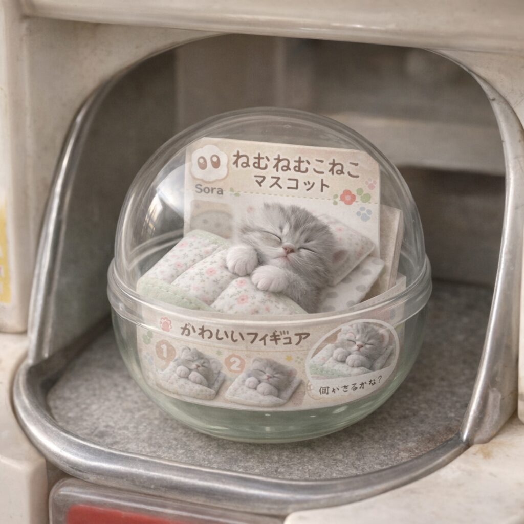 ひとつの被写体(人物・ブランドのマスコット・モノなど)をもとに、ガチャポン風のミニチュアカプセルトイを作ってください。フィギュアはシンプルでトイらしいデフォルメにし、透明なプラスチックカプセルの中にきちんと収まるサイズ感にします。カプセルの中には、日本のガチャポンらしい紙の台紙を入れ、玩具の名前、小さな商品写真、アイコン風のマーク、素朴な日本語の文字などを配置してください。カプセルは、実際のガチャポン自販機の取り出し口の中、またはすぐ手前に置かれているように見せます。素材感はリアルに表現し、つやのあるプラスチックのカプセル、少しマットなフィギュア、薄く折られた紙の台紙が分かるようにしてください。全体は、iPhone で撮影した写真のような自然な雰囲気で、やさしい光、わずかな手ブレ感、背景の軽いボケ、ちょっとしたリアルなムラやクセを残します。構図はすっきりとまとめ、被写体は中央に。ごちゃつかない、クリーンな仕上がりにしてください。