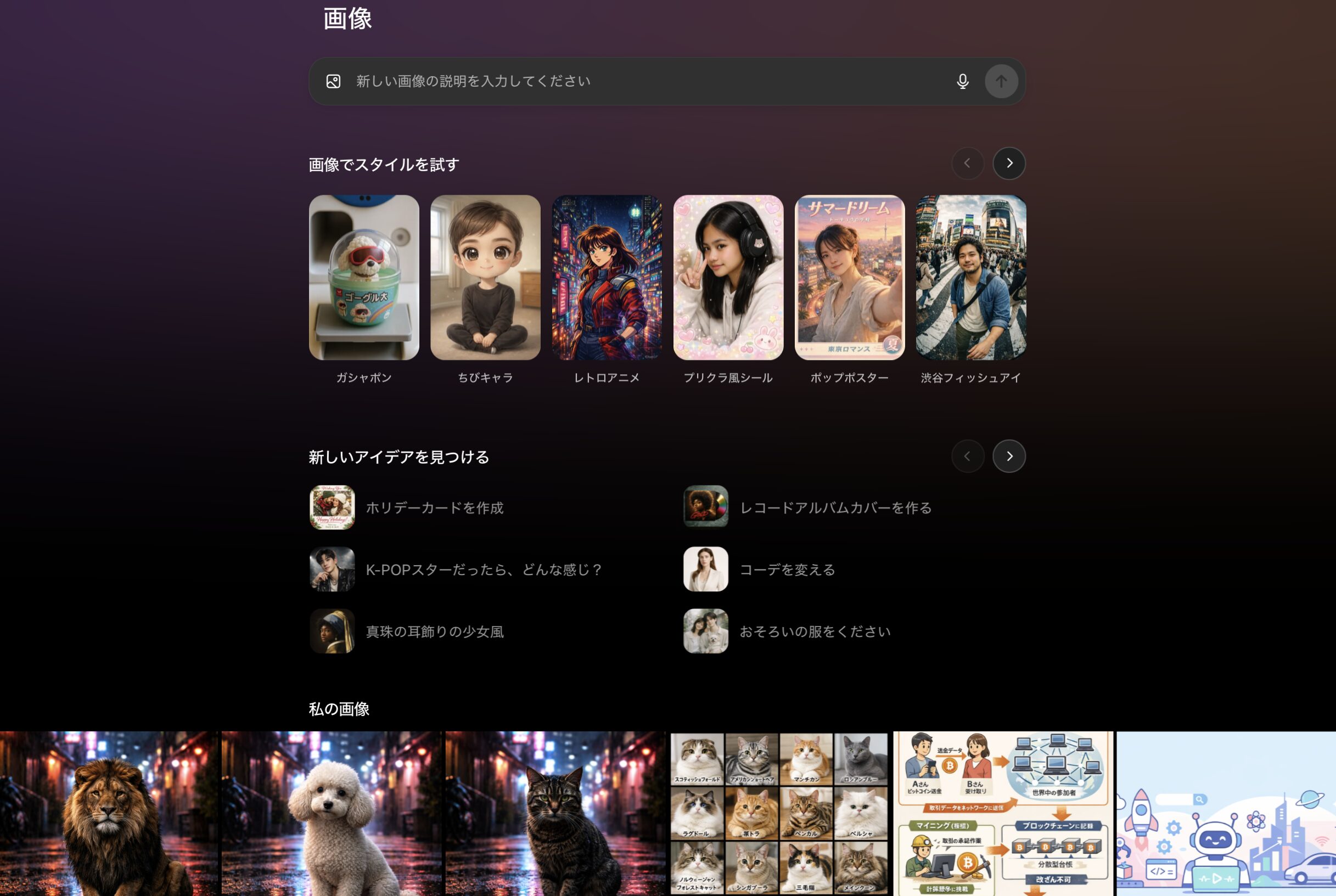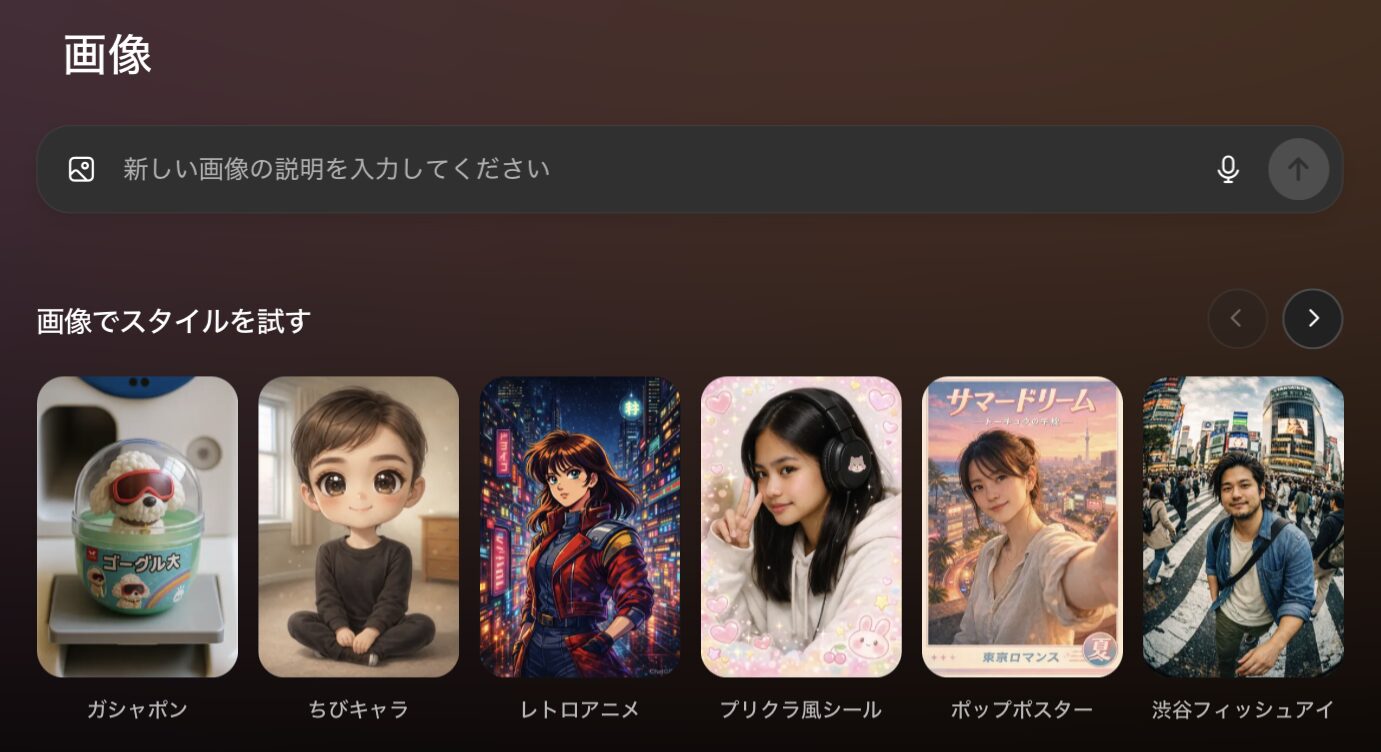 アイデアを試すもスタイルと同様に、プロンプトが自動入力される仕組みです。