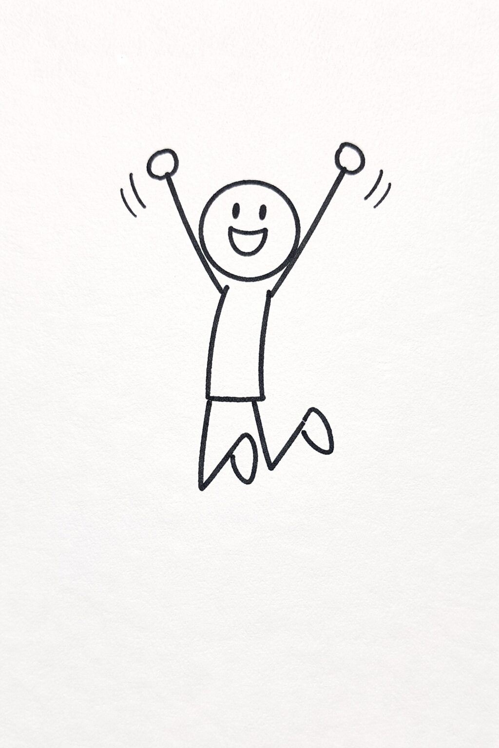 一枚の白紙に手書きで棒人間を描いて。ポーズは青春動画でよくある両手をバンザイして、ジャンプしている感じ。膝は後ろに曲がっている