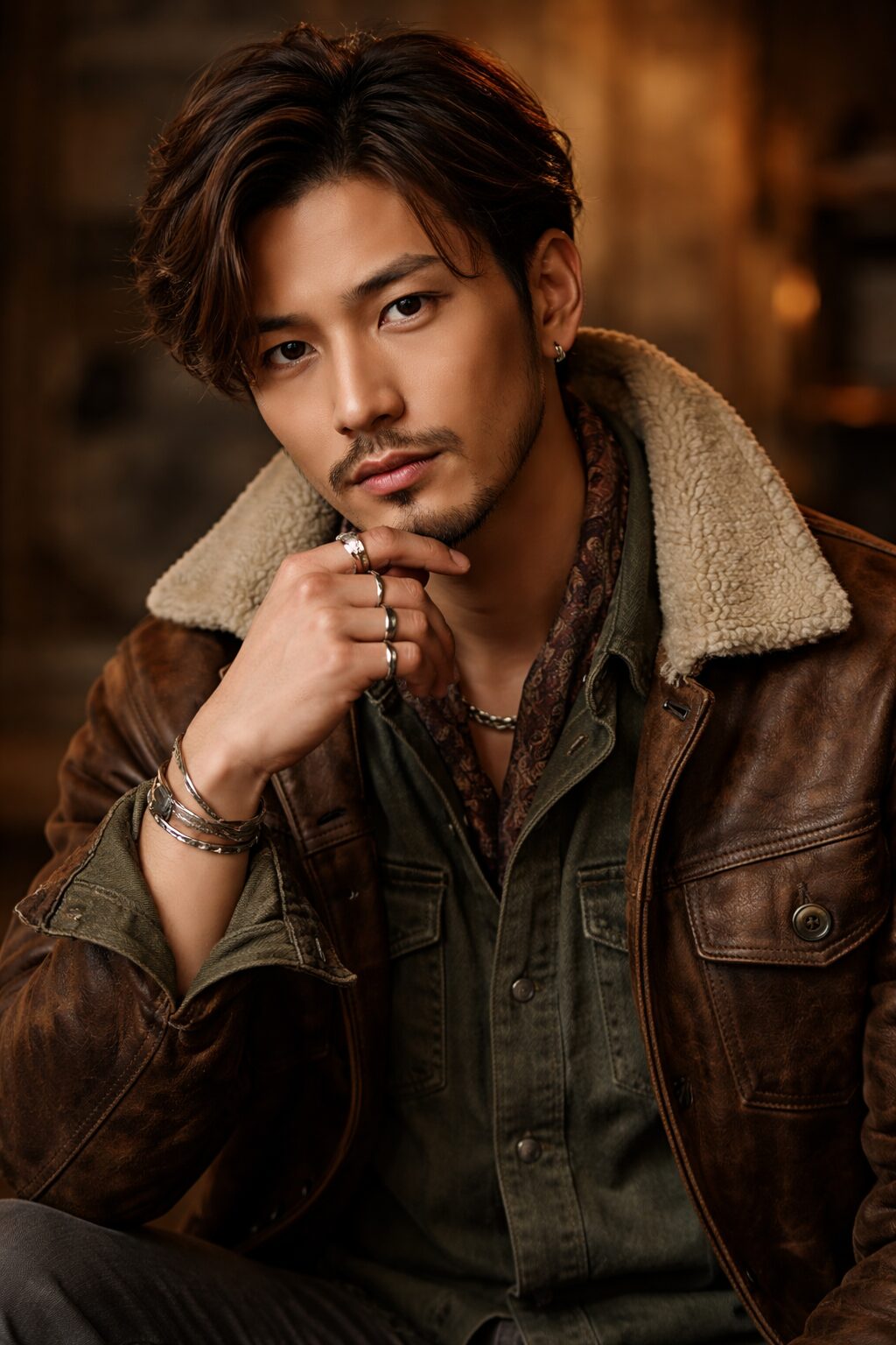 茶髪の日本人。7:3わけの髪型で髭を生やしてワイルド。30代くらい。ヴィンテージモノの洋服を着用。宣材写真で決めポーズ
