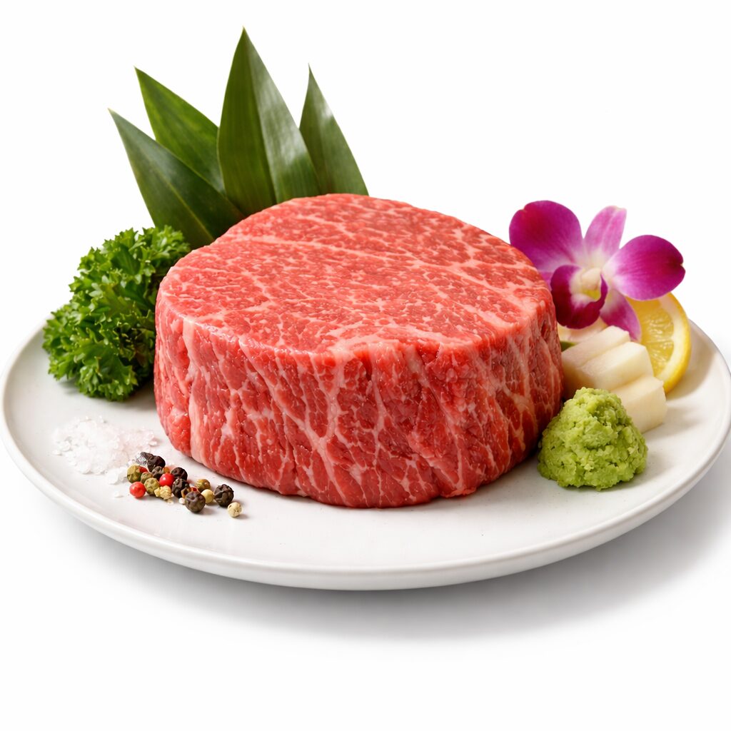 リアルで美味しそうな松阪牛のシャトーブリアンの写真を作成して。焼く前の状態でお皿に綺麗に盛り付けられている。高級店のクオリティ