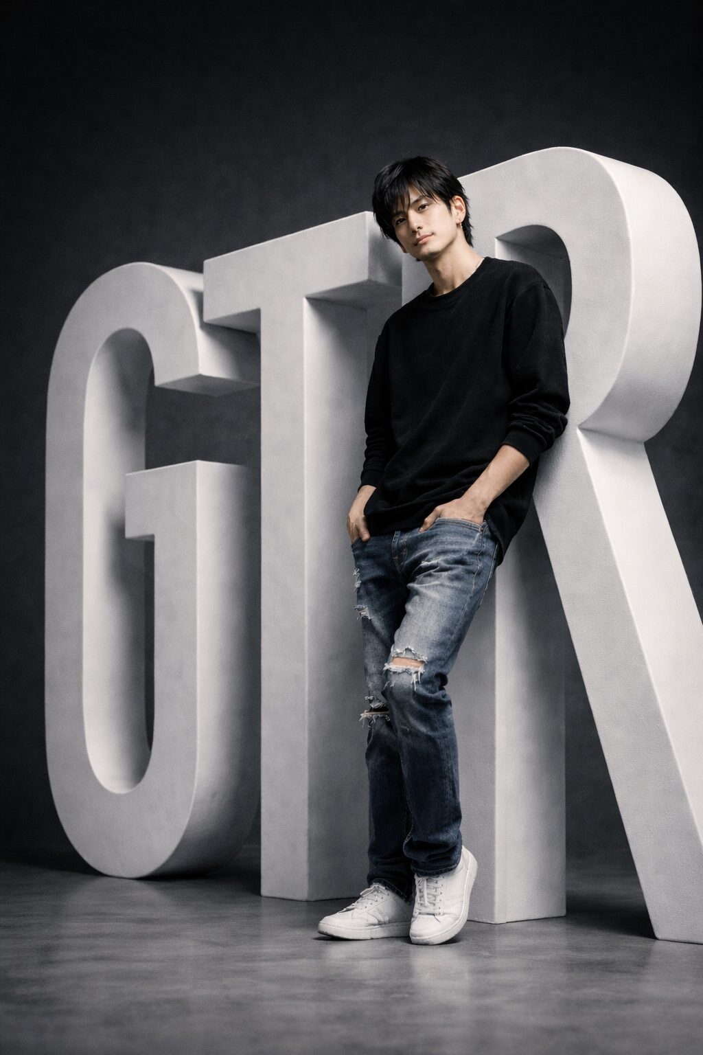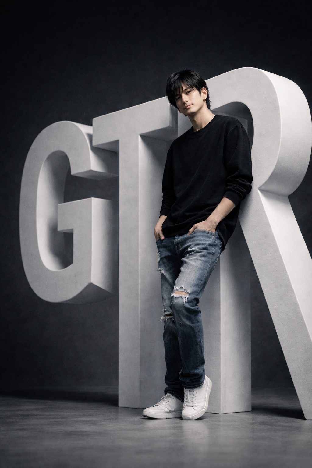 モダンなスタジオ環境でのポートレートを作成します。高さ190cmの「GTR」という文字の形をした大きな白い彫刻に、心地よく寄りかかっている姿です。27歳の私の体はサイドから撮影されており、片方の脚に体重を乗せた、リラックスしつつも自信に満ちたポーズをとっています。両手はズボンのポケットにゆったりと収まっており、自然な立ち姿を強調しています。頭をわずかに傾け、穏やかにフレームを見つめながら、切なくも思慮深い表情を浮かべています。