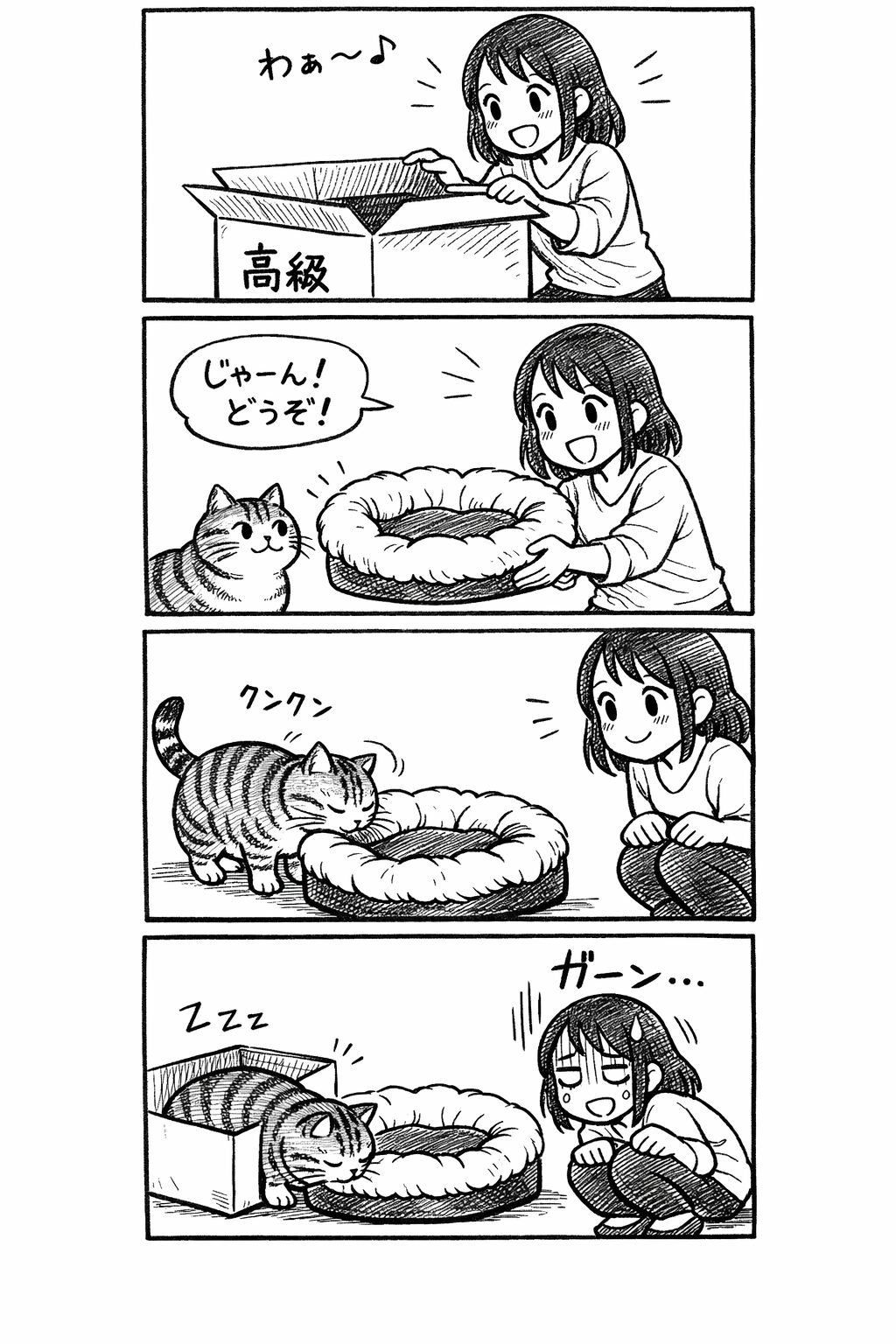 [1コマ目 (起)] 若い女性が、宅配便で届いた大きな荷物をワクワクしながら開けている。箱には「高級・猫用ベッド」と(日本語で)書かれている。 [2コマ目 (承)] 彼女はふわふわで豪華なクッションのついた猫用ベッドを組み立て、愛猫(丸々としたトラ猫)に「どうぞ!」と誇らしげに見せている。 [3コマ目 (転)] 猫は興味深そうに近づき、匂いを嗅いでいる。女性は期待の眼差しで見守る。 [4コマ目 (結・オチ)] 猫は高級ベッドの「隣にあった空の段ボール箱」の中に満足そうに入って丸まって寝ている。女性は高級ベッドの前でガックリと肩を落とし、白目をむいてショックを受けている。コミカルな汗の表現。