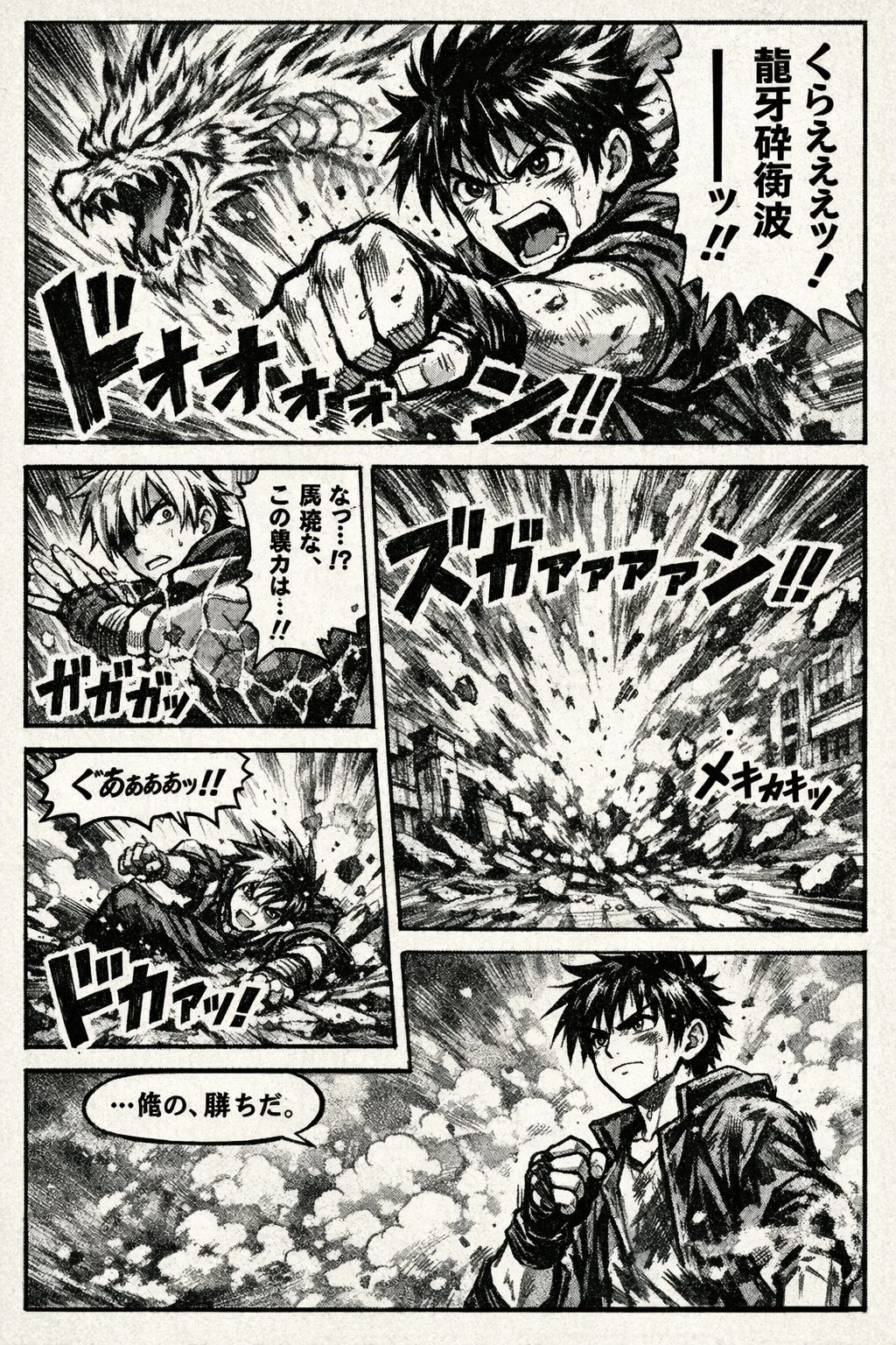 1コマ目 (右上、大ゴマ): 熱血な主人公の少年が渾身の力で拳を突き出し、必殺技を放っている瞬間。顔は気迫に満ち、汗と血が飛び散る。背景には巨大なエネルギーの龍のエフェクト。 フキダシ(日本語): 「くらえぇぇッ! 龍牙砕衝波(りゅうがさいしょうは)ーーッ!!」 効果音(日本語、巨大な描き文字): 「ドォォォォン!!」