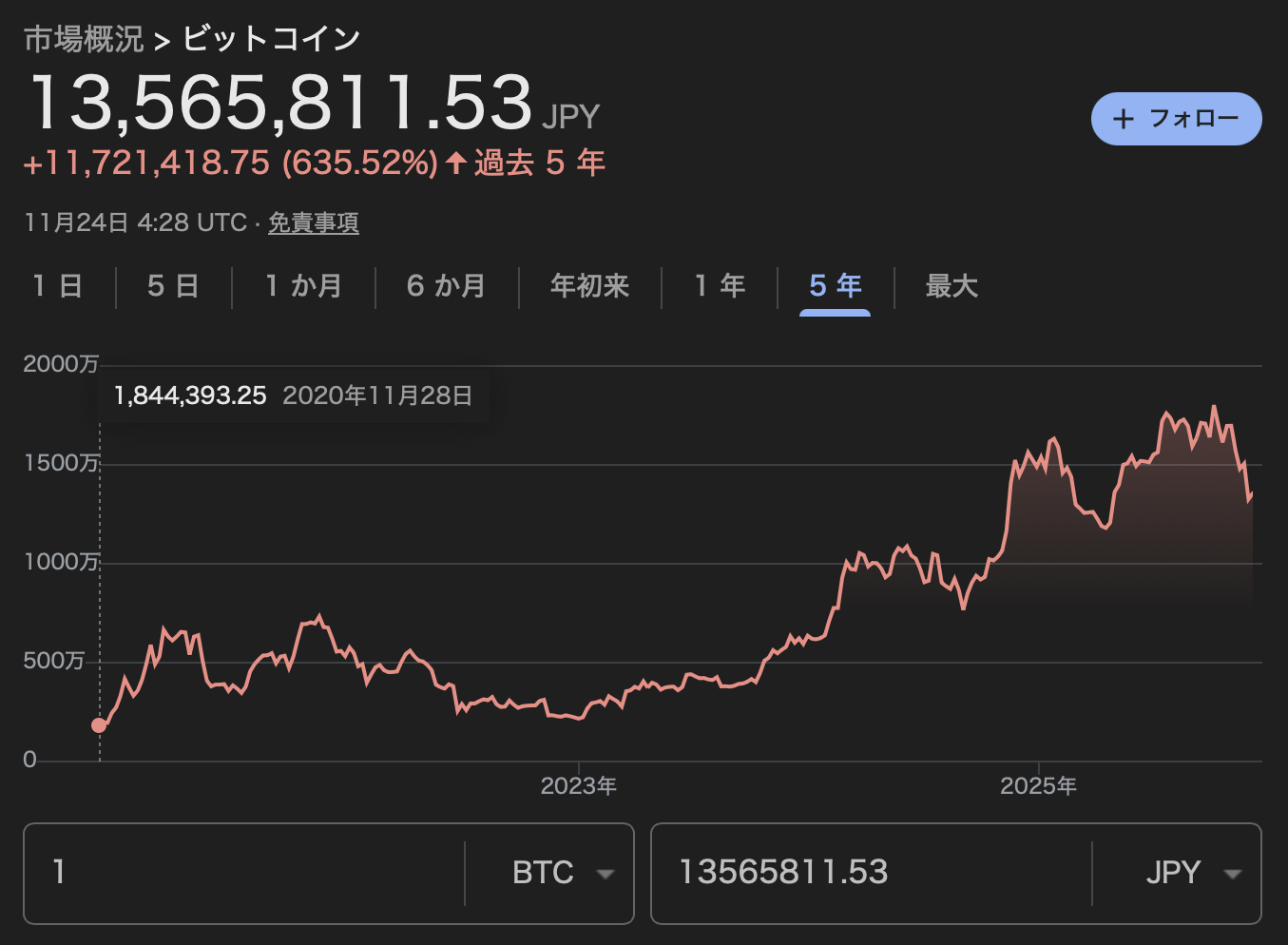 2025年11月24日現在のビットコインの価格は「約1,300万円」で、直近1年間では二度目の大暴落を見せています。