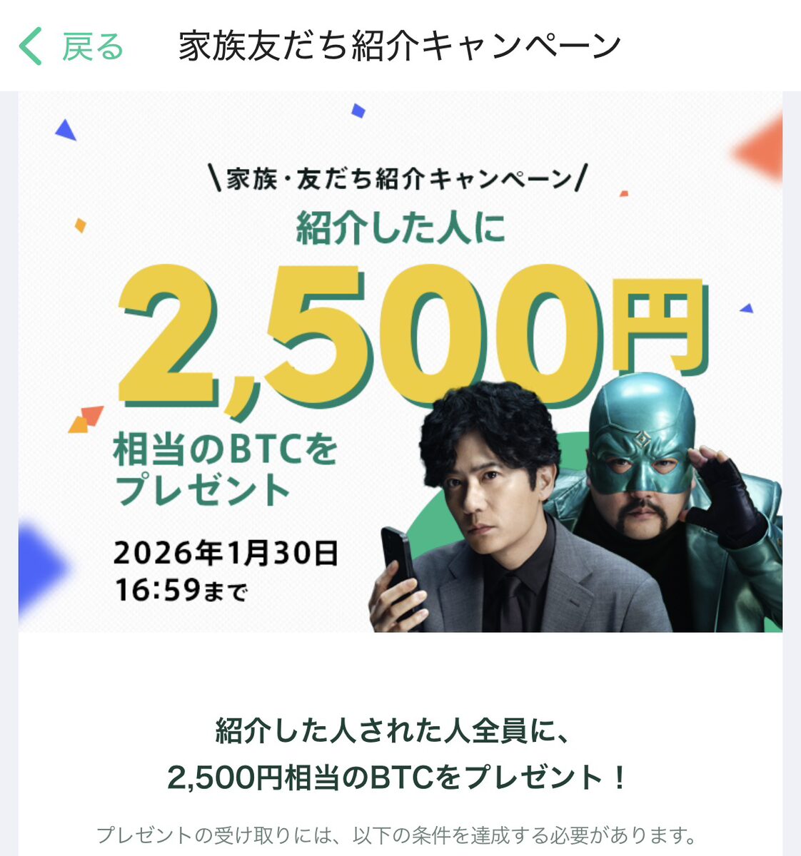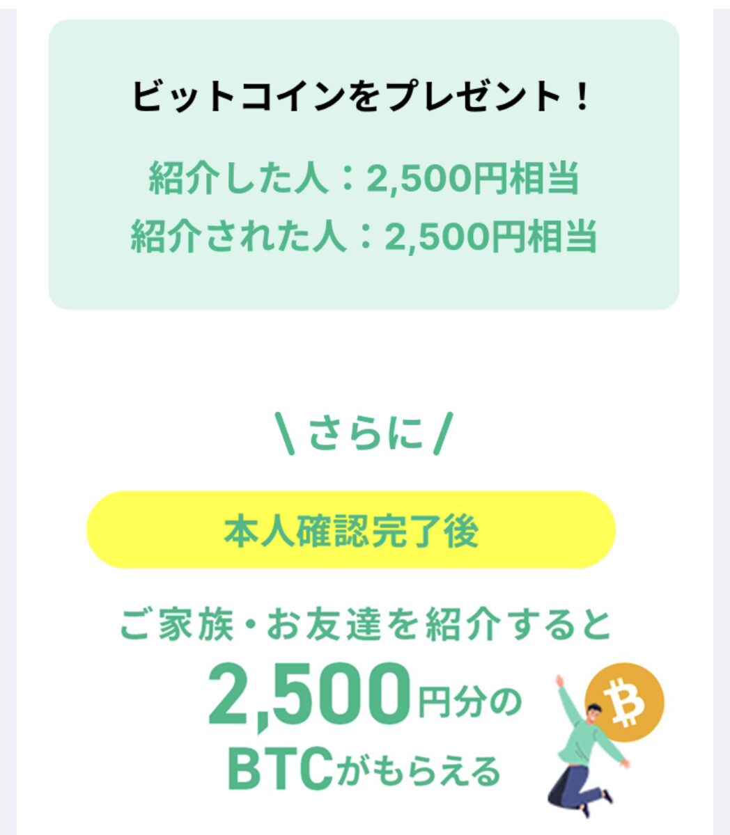 なんと今なら招待した人・招待された人の両方に「2,500円相当のビットコイン(BTC)」が付与されるというものです。